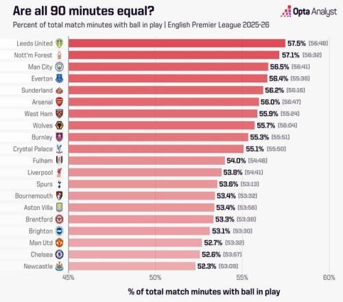 近日,权威统计机构opta公布了英超20队的净比赛时间占比,纽卡斯尔联、切尔西和曼联是倒数前三名。每场足球比赛...