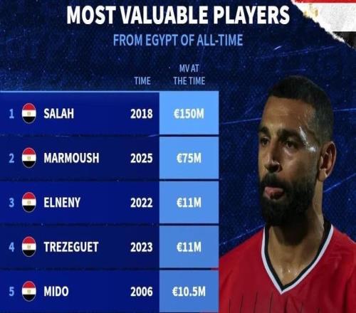 北京时间10月13日,德转统计出了埃及球员历史身价榜,2018年身价曾经达到1.5亿欧元的萨拉赫排名第一,马尔穆什750...