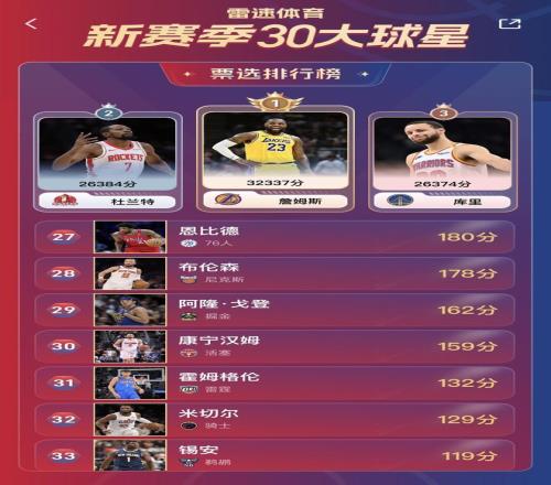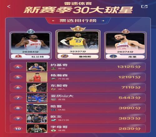 雷速NBA30大球星即时排名:詹姆斯稳坐头名,杜兰特库里伯仲之间,杨瀚森第5