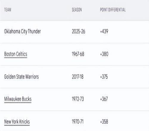 说到疯狂的数据,雷霆本赛季至今的总净胜分已高达439分,以近乎悬殊的优势刷新了NBA历史前25场比赛的净胜分纪录(原纪录是1967-68赛季凯尔特人的380分)。上赛季,雷霆每百回合净胜分12.9分,已是历史最佳;而本赛季25场战罢,他们将这一纪录大幅提升至恐怖的+17.5分。